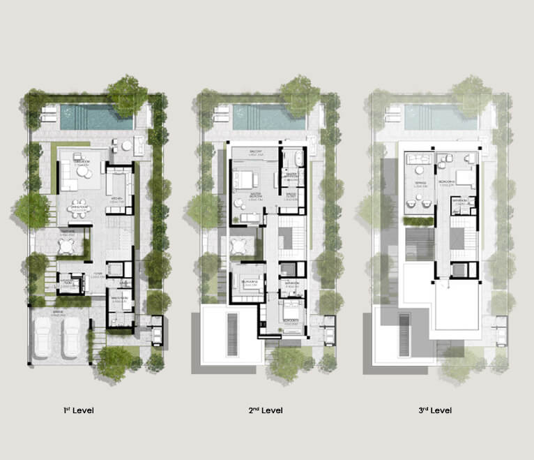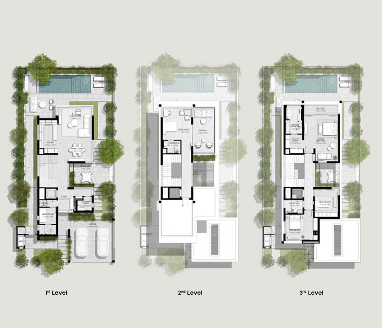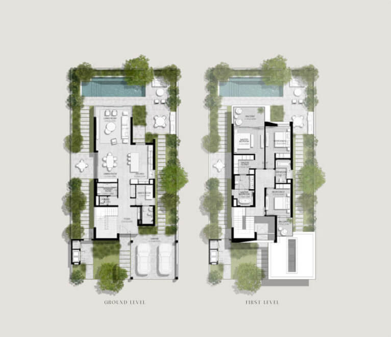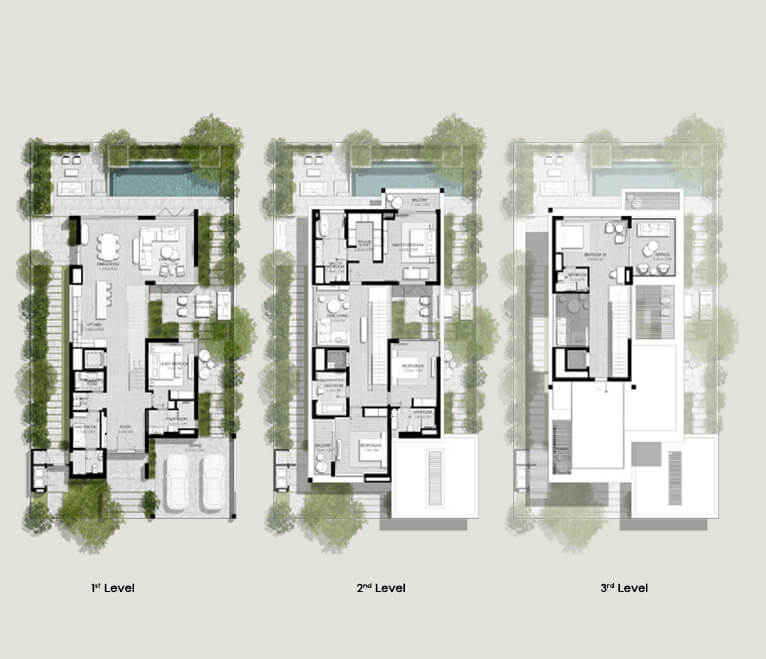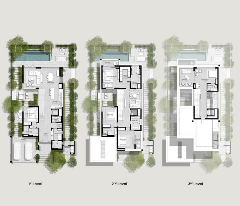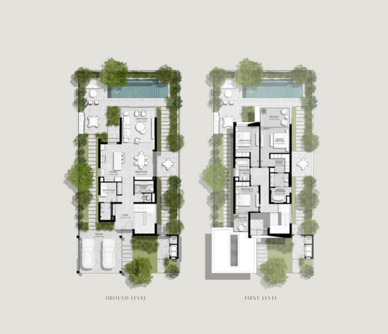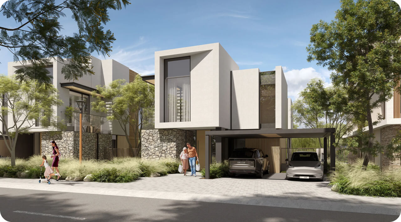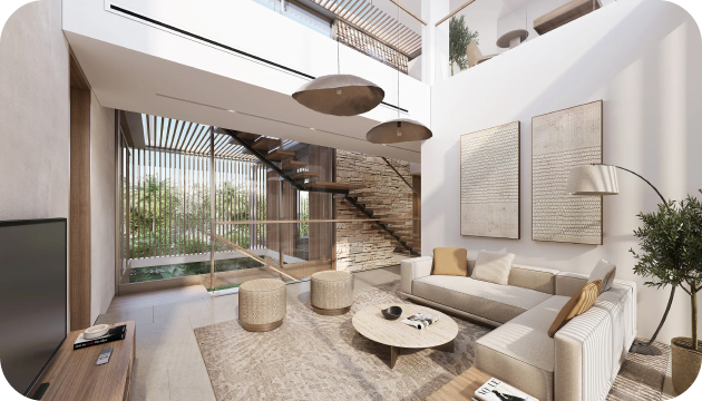 Luxurious 3 to 5-bedroom villas boasting contemporary design, open-plan layouts, and floor-to-ceiling windows.